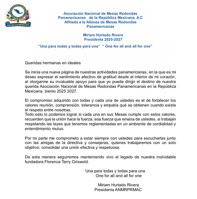 Se inicia una nueva página de nuestras actividades panamericanas, en la que es mi deseo expresar el sentimiento afectivo de gratitud desde el interior de mi corazón, al otorgarme su invaluable apoyo para que yo pueda dirigir el destino de nuestra querida Asociación Nacional de Mesas Redondas Panamericanas en la República Mexicana, bienio 2025 2027.